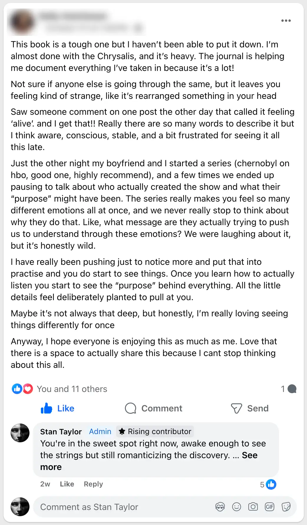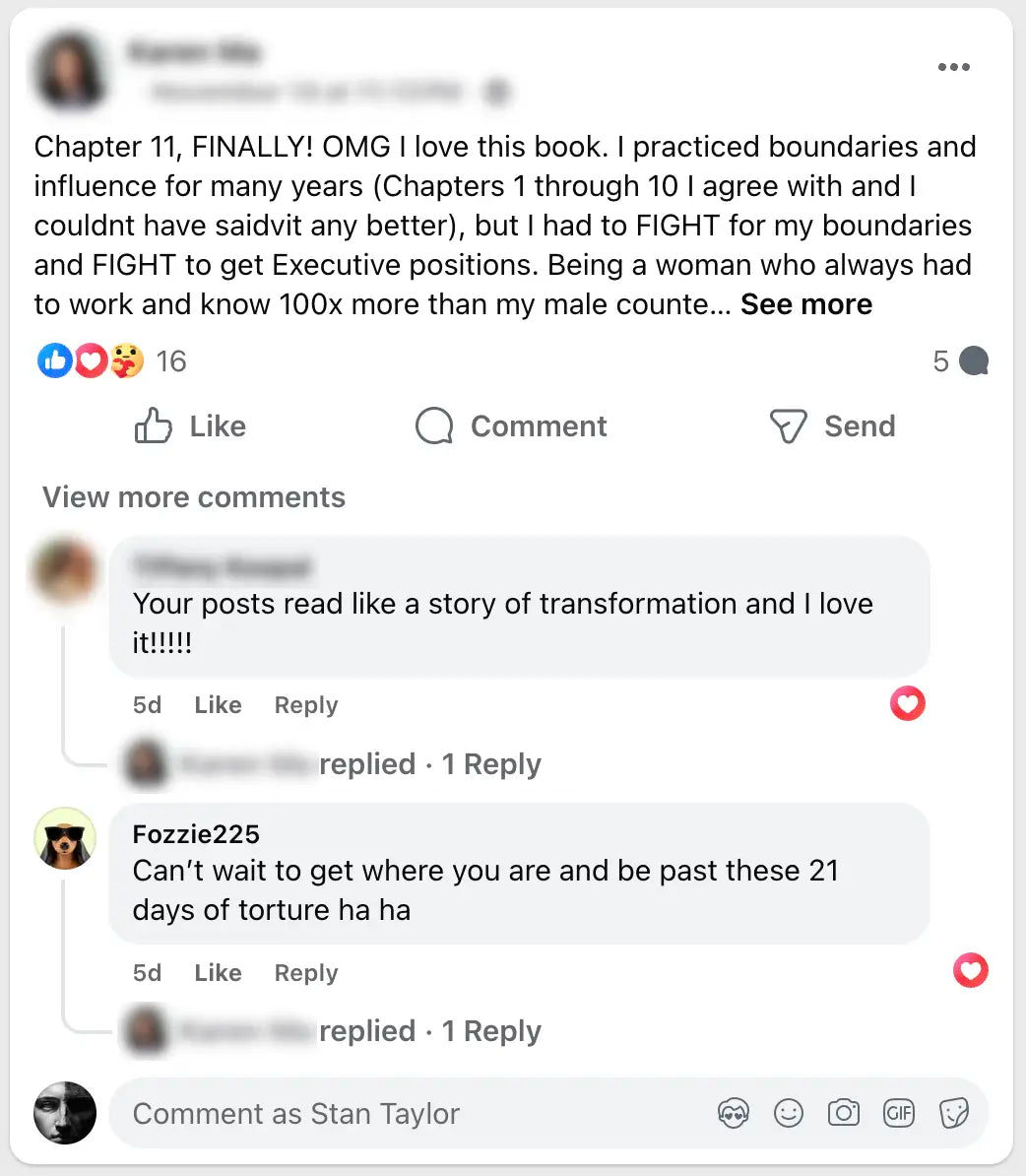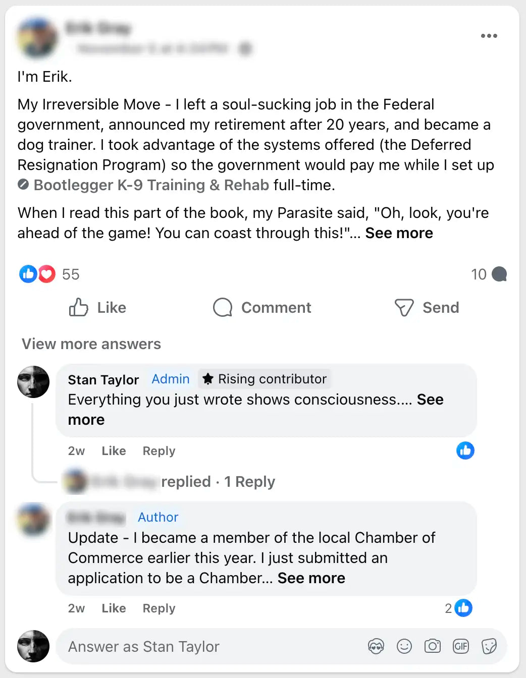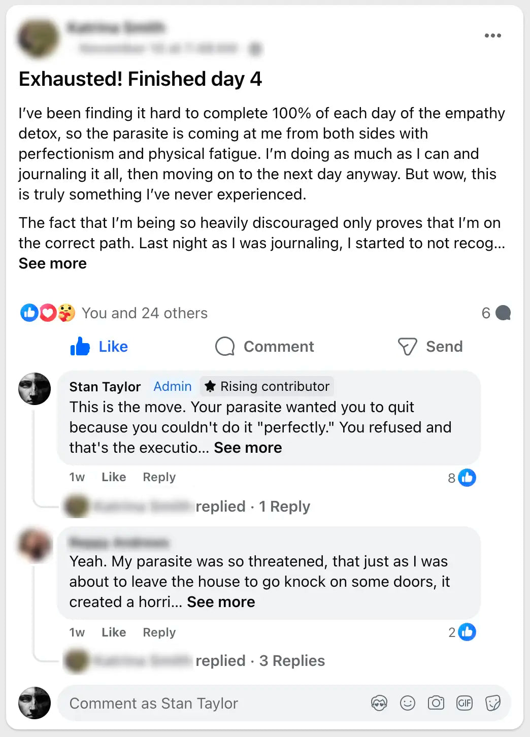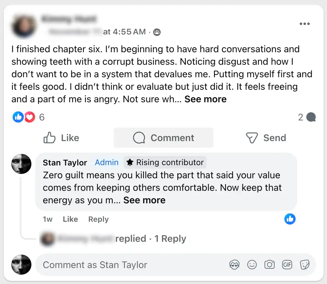 Yes. After purchase, you'll get an invite to a private Facebook group. But it's not for everyone. I created the underground community after readers started reporting the initial isolation of their awakening. Turns out, when you kill your parasite, the people still feeding theirs get uncomfortable. When you build your Fortress Mind, the Walking Dead think you've gone cold. You need others who get it, won't judge you for finally choosing power over politeness, and who understand why Chapter 5 made you cry and Chapter 13 made you dangerous.
