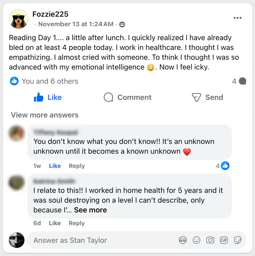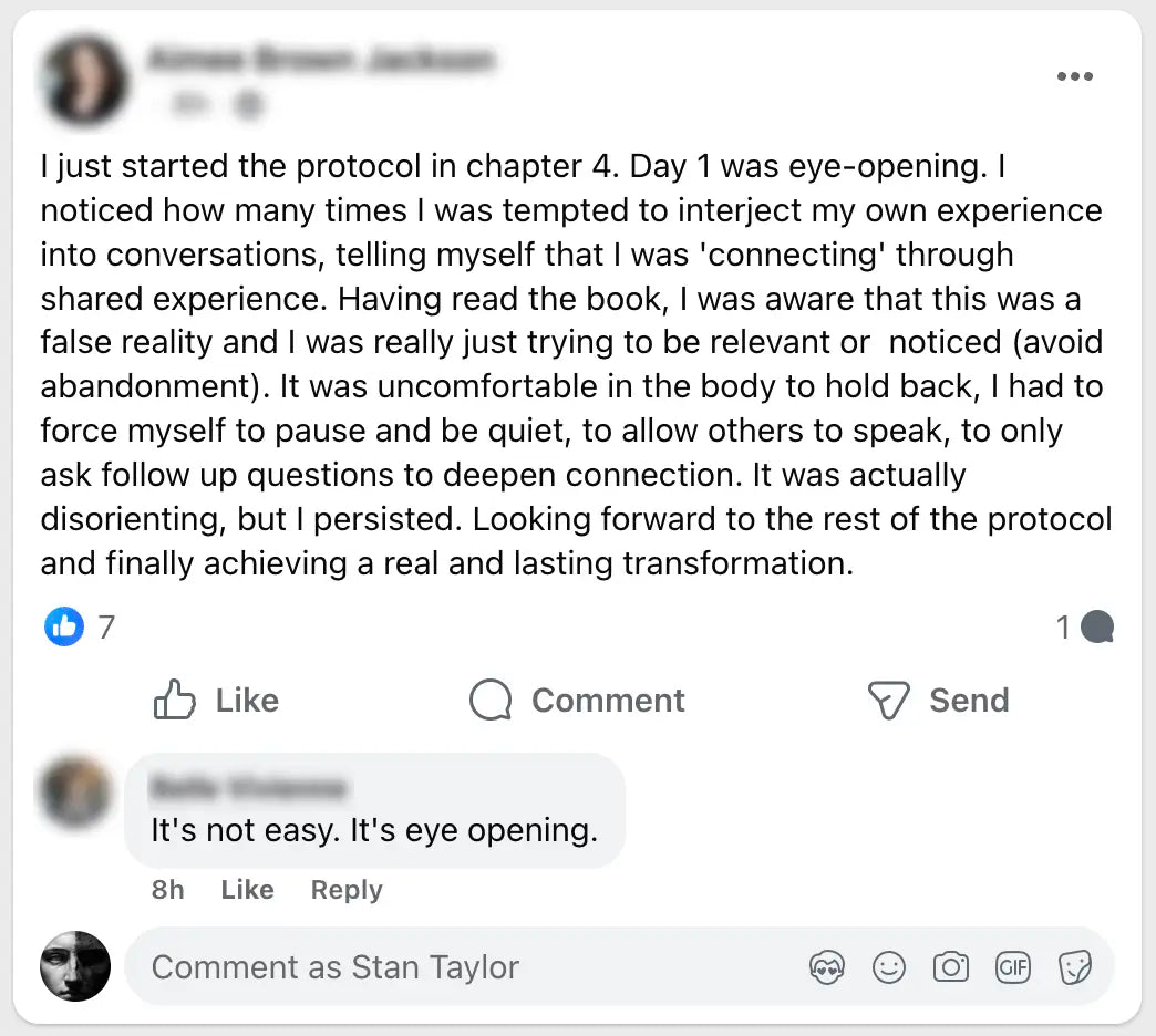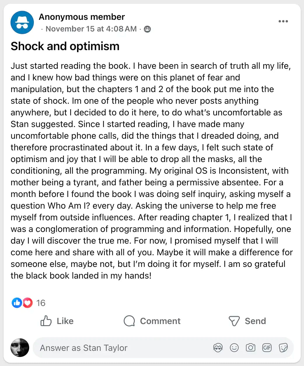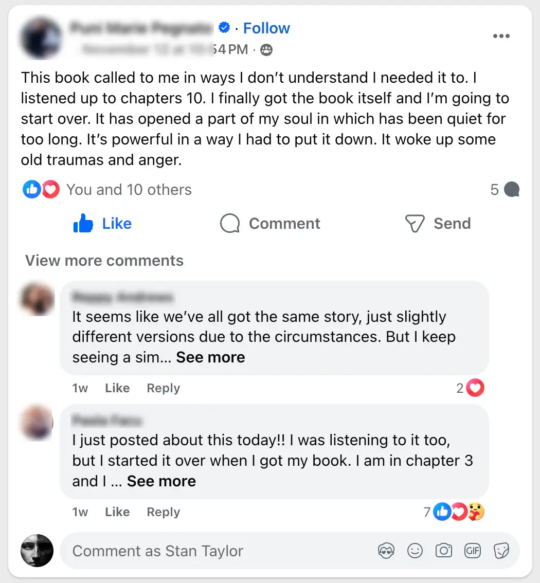 Yes. After purchase, you'll get an invite to a private Facebook group. But it's not for everyone. I created the underground community after readers started reporting the initial isolation of their awakening. Turns out, when you kill your parasite, the people still feeding theirs get uncomfortable. When you build your Fortress Mind, the Walking Dead think you've gone cold. You need others who get it, won't judge you for finally choosing power over politeness, and who understand why Chapter 5 made you cry and Chapter 13 made you dangerous.