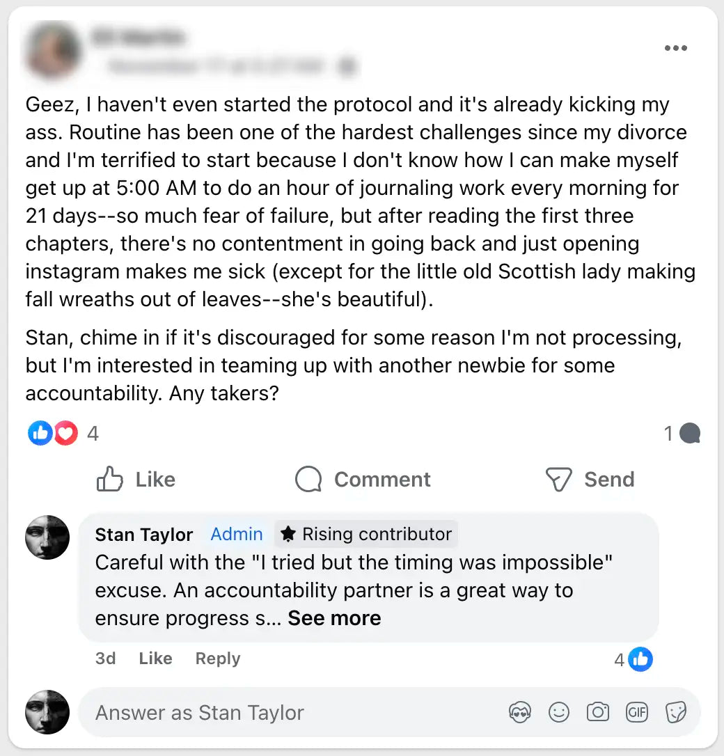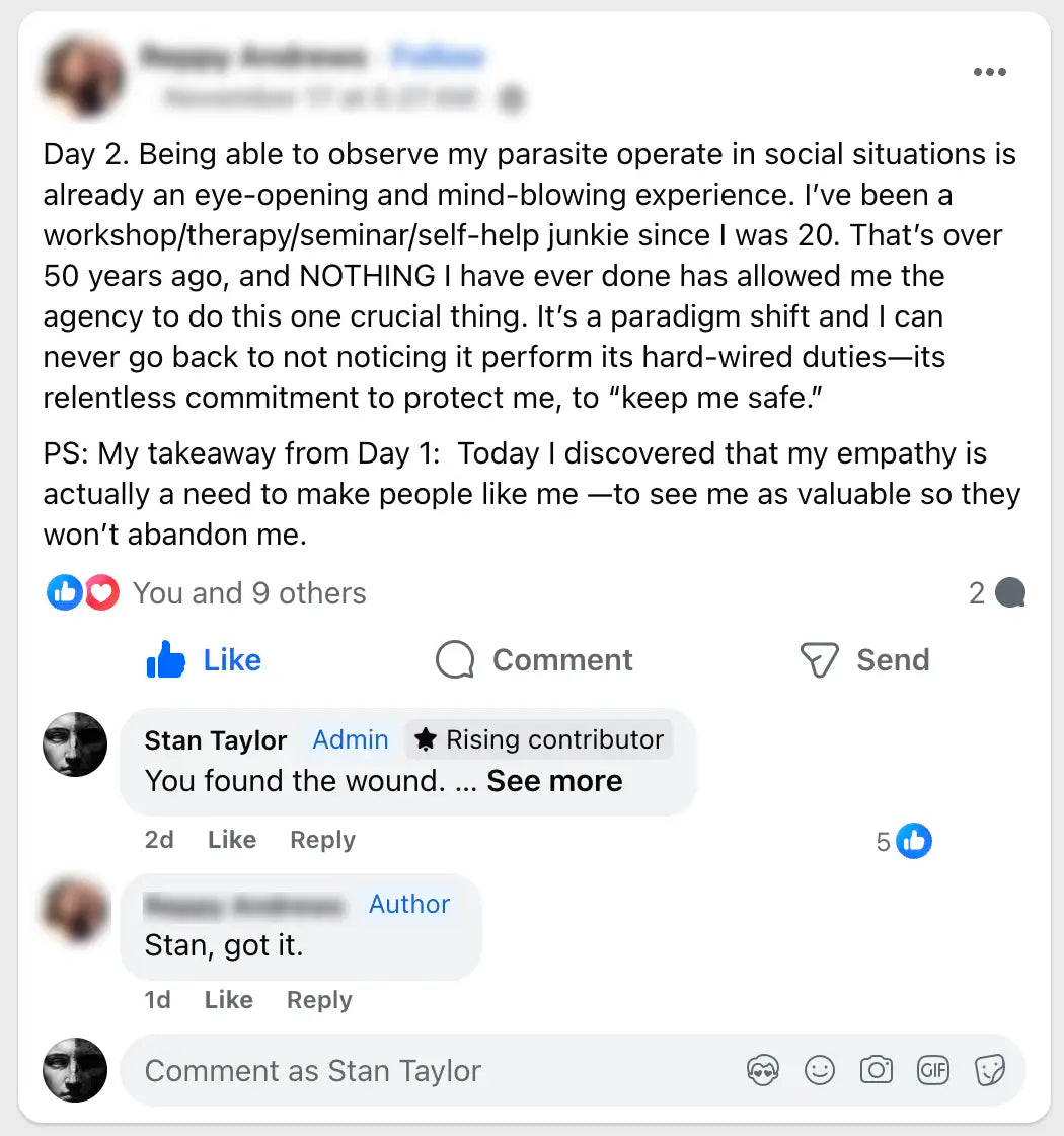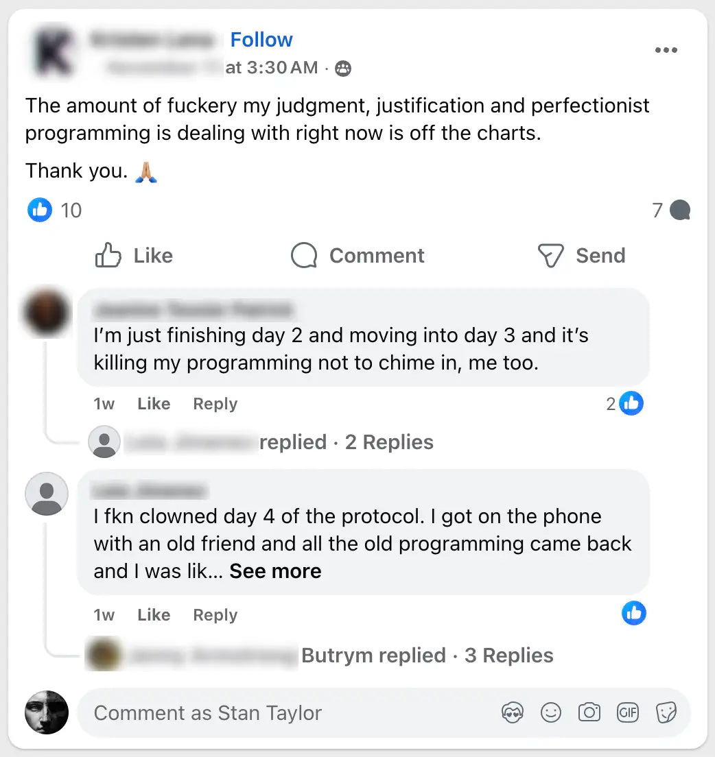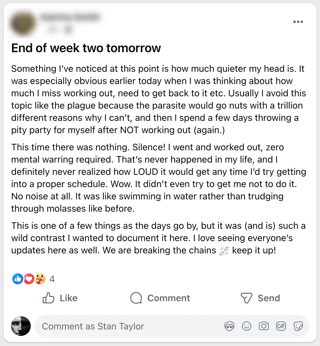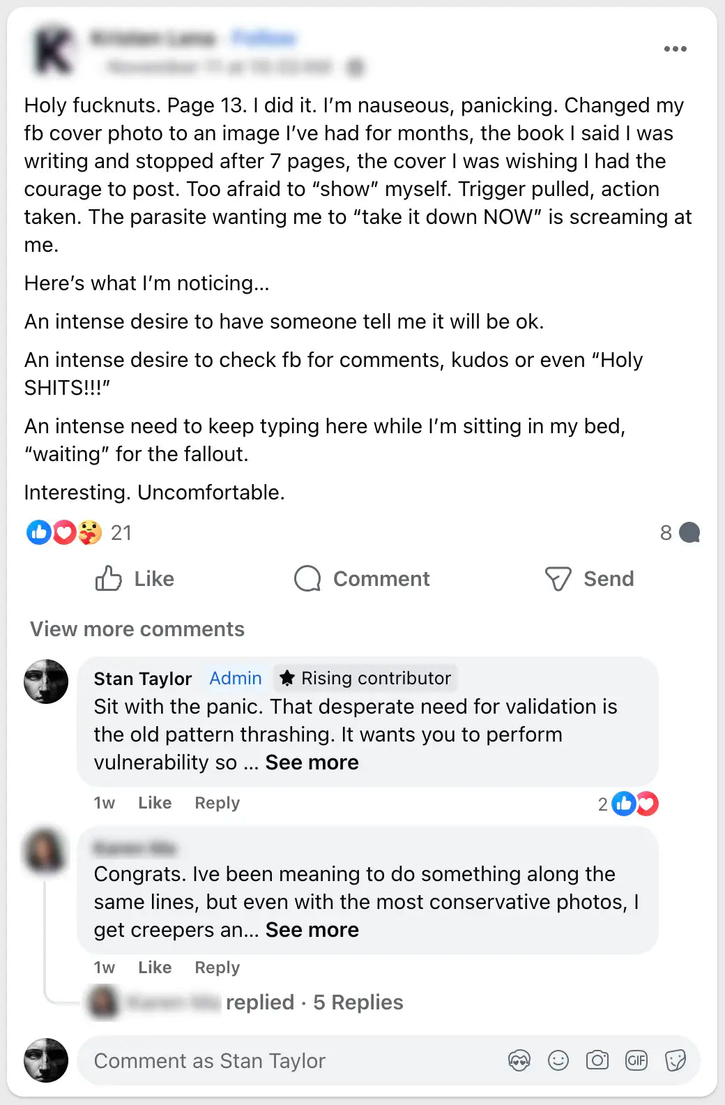 Yes. After purchase, you'll get an invite to a private Facebook group. But it's not for everyone. I created the underground community after readers started reporting the initial isolation of their awakening. Turns out, when you kill your parasite, the people still feeding theirs get uncomfortable. When you build your Fortress Mind, the Walking Dead think you've gone cold. You need others who get it, won't judge you for finally choosing power over politeness, and who understand why Chapter 5 made you cry and Chapter 13 made you dangerous.